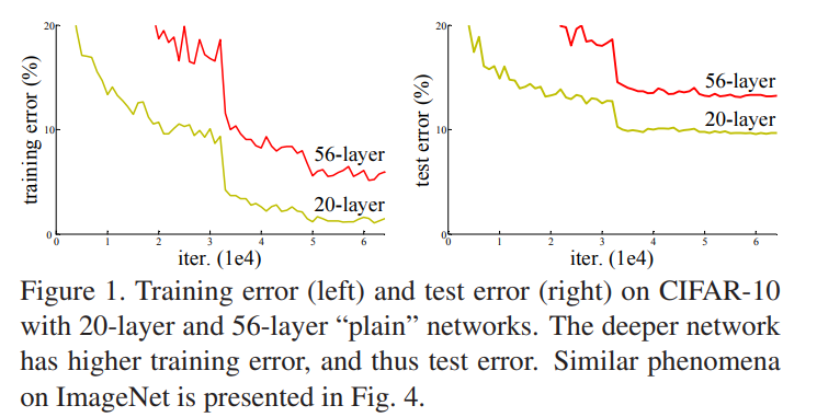 - Deep Convolutional Neural Network (VGG, GoogLeNet)는 classfication 등에서 뛰어난 성과를 냈으나, depth가 늘어날수록 학습이 어려워지며 Figure 1. 결과처럼 training error가 발생하는 문제가 발생함. (네트워크가 Identity Mapping 을 표현하기 어려워 발생하는 문제.)