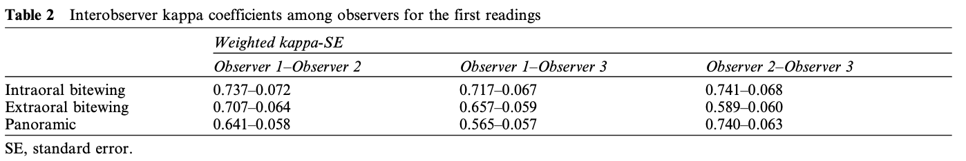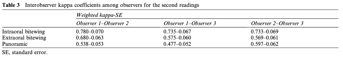 따라서 구내 교익(Intraoral Bitewing) 영상에서 관찰자 간 일치도가 가장 높게 나타났으며, 구외 교익 및 파노라마는 상대적으로 일치도가 낮았다.