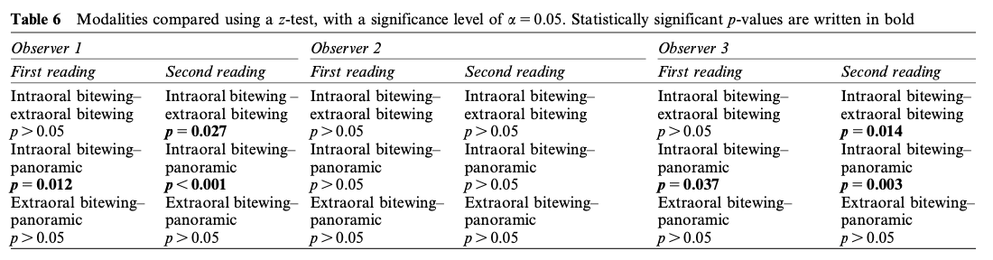 - 구내 교익 vs 파노라마: 대부분의 관찰자에서 구내 교익이 통계적으로 유의미하게 우수했다.