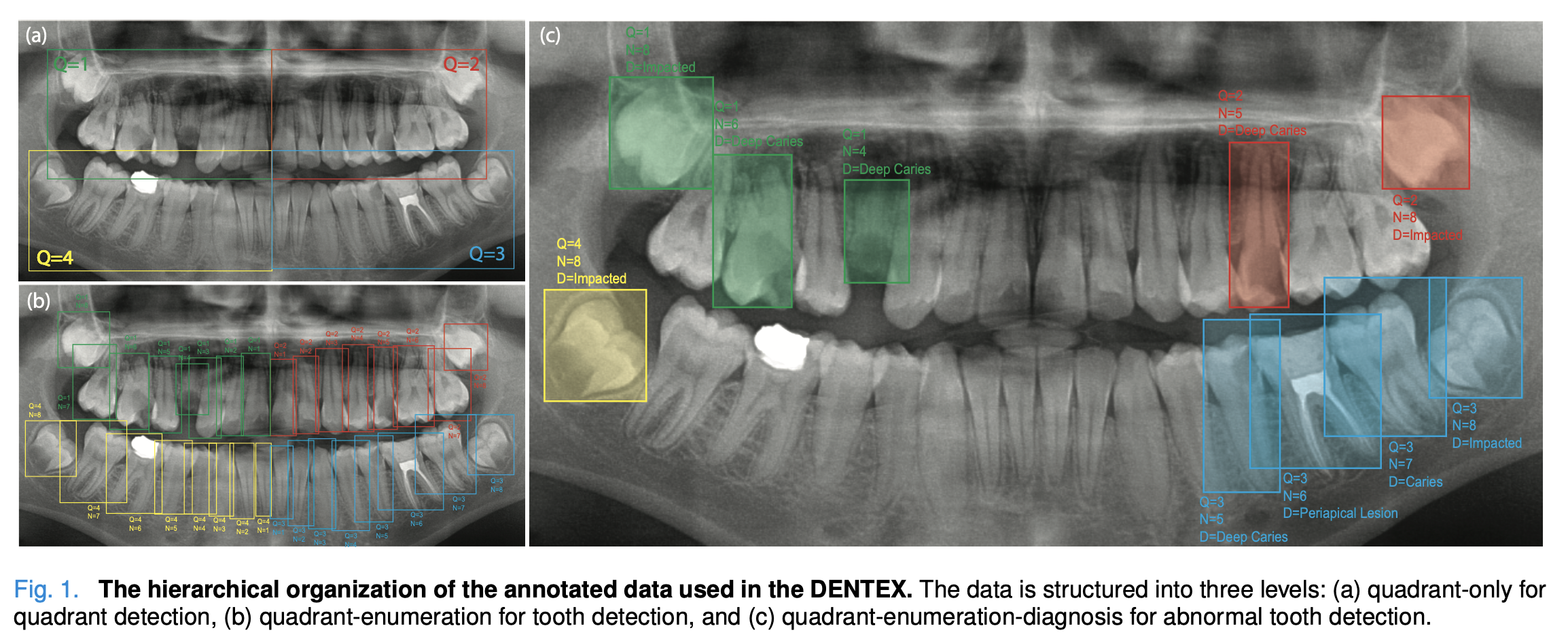 (c) 1005 X-rays fully annotated for abnormal tooth detection, including quadrant, enumeration, diagnoses.