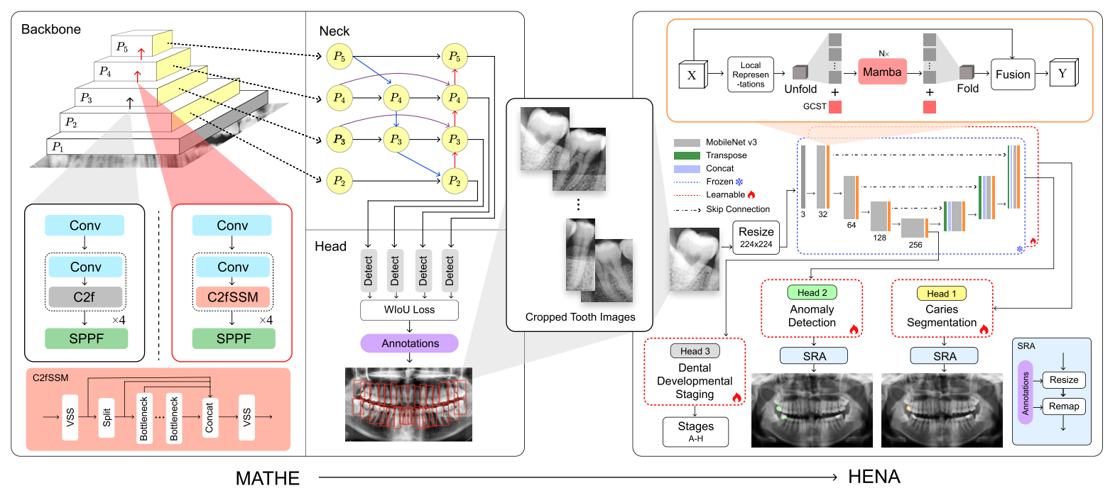 Dental diagnosis from Orthopantomograms (OPGs) requires coordination of tooth detection, caries segmentation (CarSeg), anomaly detection (AD), and dental developmental staging (DDS). We propose Mamba-based Architectural Tooth Hierarchical Estimator and Hol