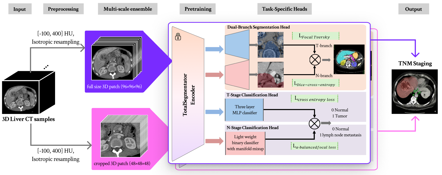 RUPPELL 팀은 간암 환자의 CT/MRI 영상을 기반으로 TNM Staging을 자동 수행하는 모델을 개발합니다. TNM 분류 체계(Tumor-Node-Metastasis)는 암의 진행 단계를 평가하는 국제 표준으로, AI 기반 자동 병기 분류는 영상의학과 전문의의 판독 효율성을 크게 향상시킬 수 있습니다.