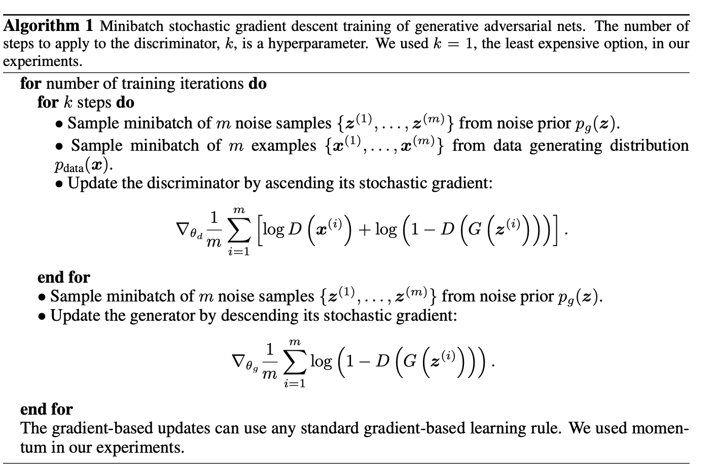 근데 이걸 practical하게 하긴 어려운게 계산량이 너무 크고 데이터셋이 유한해서 overfitting 발생함. alternating training 방법으로 D를 k번 업데이트하고 그 다음 G를 1번 업데이트하는 방법을 씀.
